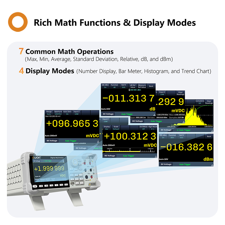 + Comprehensive math functions, include Max, Min, Average, Standard Deviation,Relative Measurement, Bar Graph, Histogram, Trend Chart, dB/dBm, Limit test, and more; perform data analysis directly on the instrument without extra software