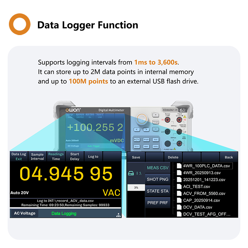 + Data Logger Function: records all measurement values in CSV format, with a fastest logging interval of 1ms, 2M points capacity, and expandable to 100M points via USB drive