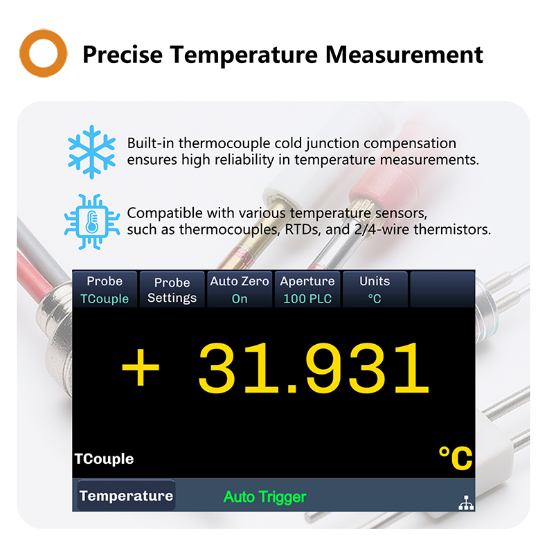 + Built-in thermocouple cold junction compensation, no need for external compensation hardware, saving accessory costs and improving temperature measurement accuracy