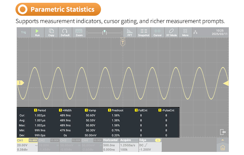 + 50M storage depth, up to 700,000wfms/s waveform refresh rate, ensuring clear signal capture.