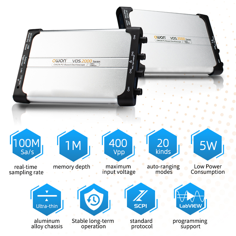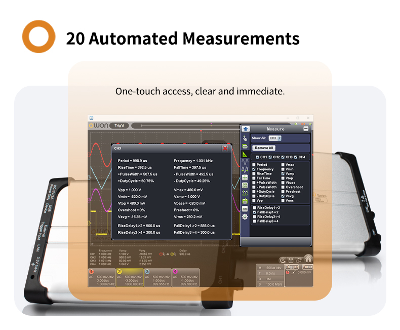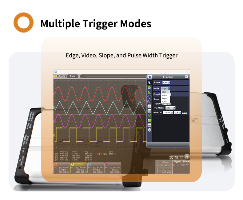 + Multiple trigger modes: Supports edge, video, slope, and pulse width triggering