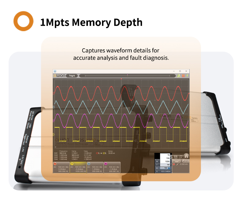 + Each channel features 1M storage length, allowing capture and preservation of more waveform details to aid engineers in more accurate analysis and fault diagnosis