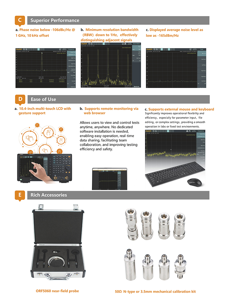 −165dBm/Hz, phase noise of −106dBc/Hz (10 kHz offset), and a minimum resolution bandwidth (RBW) of 1 Hz. With full-scale amplitude accuracy of 0.7 dB, it ensures high sensitivity and dynamic performance when capturing and analyzing transient or low-level signals.