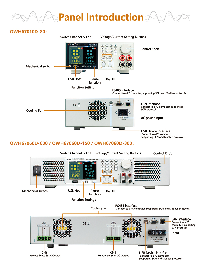 The OWH67D series comes with standard LAN /RS485 / USB interfaces, supporting SCPl and Modbus protocols. It allows remote control via USB communication for real-time monitoring and flexible output co