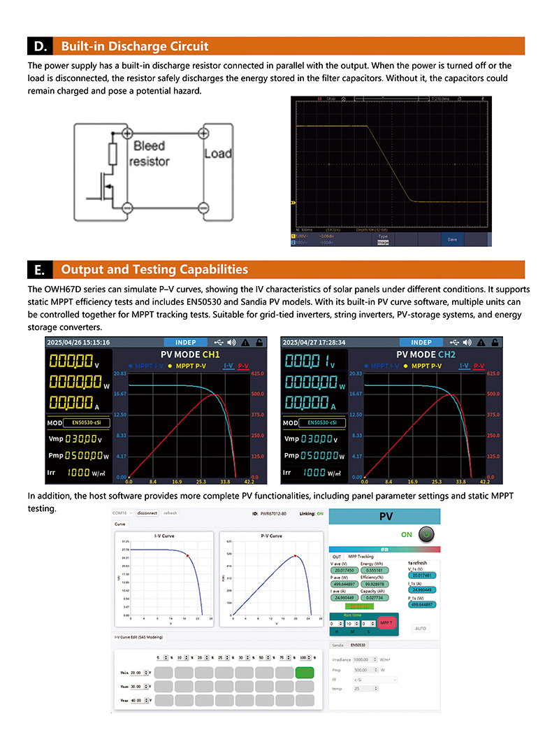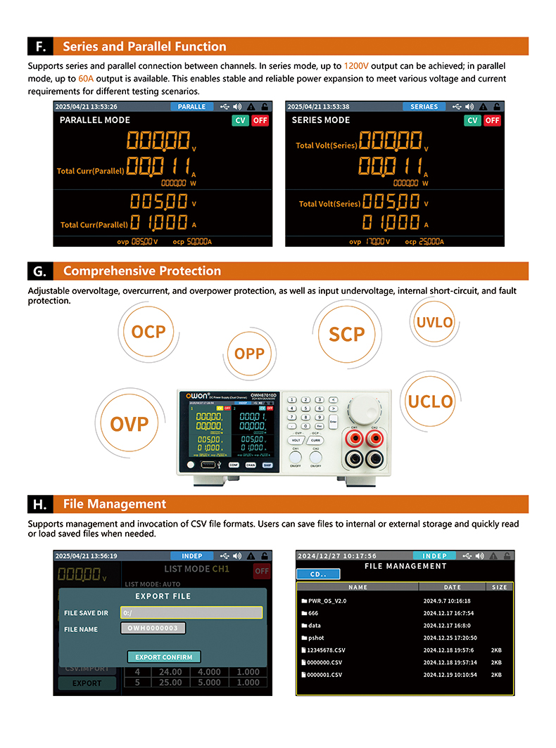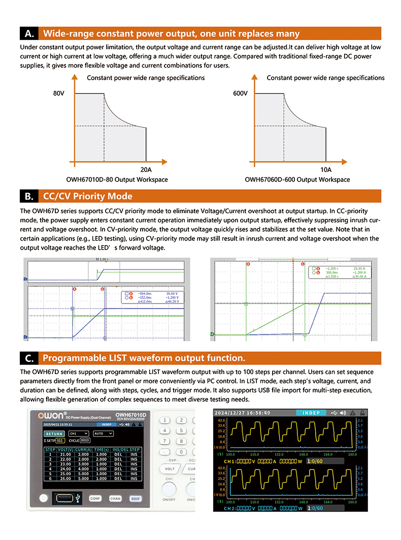 The OWH67D Series is a dual-channel high--power programmable DC power supply that supports wide-range constant power output. It includes models OWH67010D-80 (80V/20A,1000W),