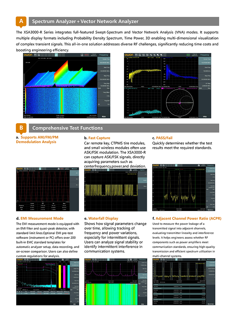 Standard features include a tracking generator, preamplifier, and Distance to Fault mode. Multiple display modes, including probability density spectrum, time power, 3D visualization, enable multi-dimensional signal observation. It comes with 40 MHz real-time bandwidth (optional 100MHz) and optional EMI software.